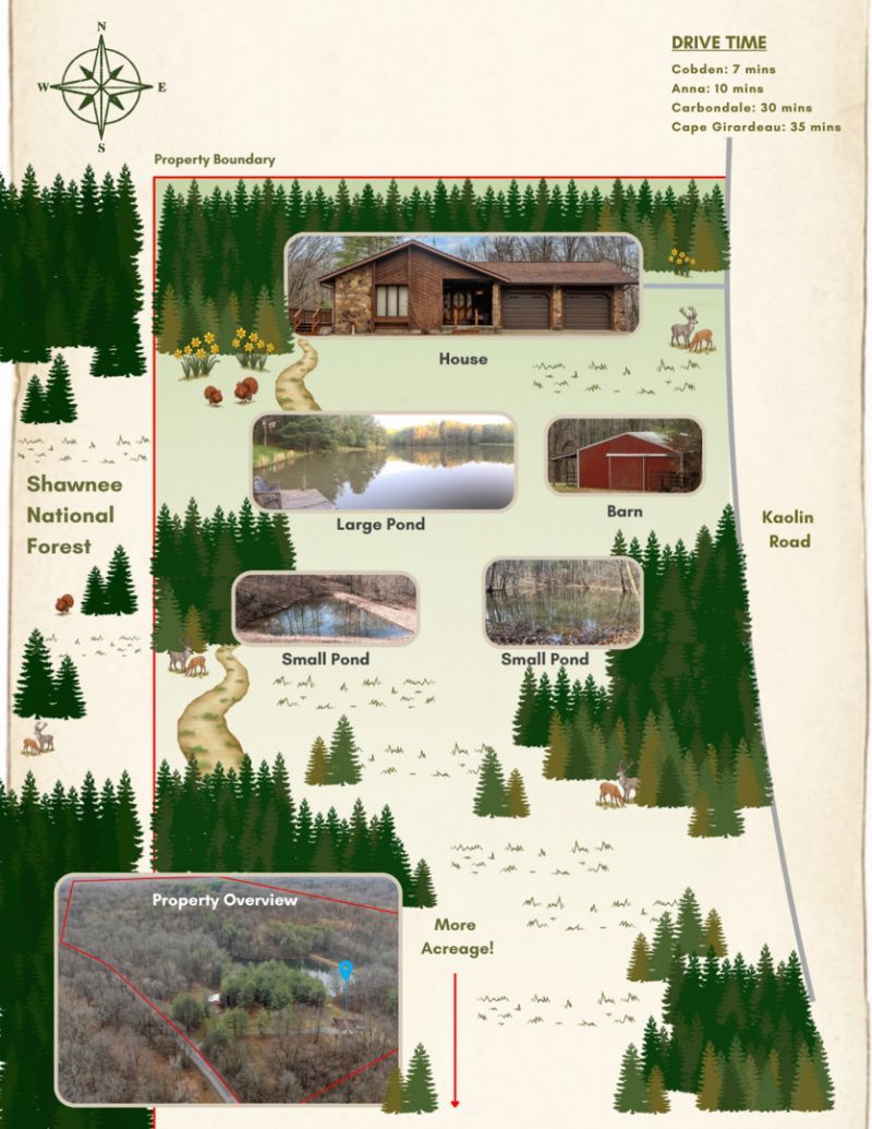 If you've been waiting for the kind of property that rarely hits the market-this is it. Set on 74 acres and adjoining the Shawnee National Forest, 3085 Kaolin Rd offers the perfect blend of privacy and play. Fish your own two stocked ponds (bass and crappie), hunt or watch the abundant deer and turkey, and enjoy a burst of spring color as daffodils bloom across the land. A 30x40 pole barn with electricity and water is ready for projects, storage, or outdoor gear. The home includes 3 bedrooms, 2 baths, 1,521 sq ft, and a walk-out basement that adds flexibility for recreation space, guests, or future expansion. Full-time home, weekend getaway, or hunting headquarters-this one fits.